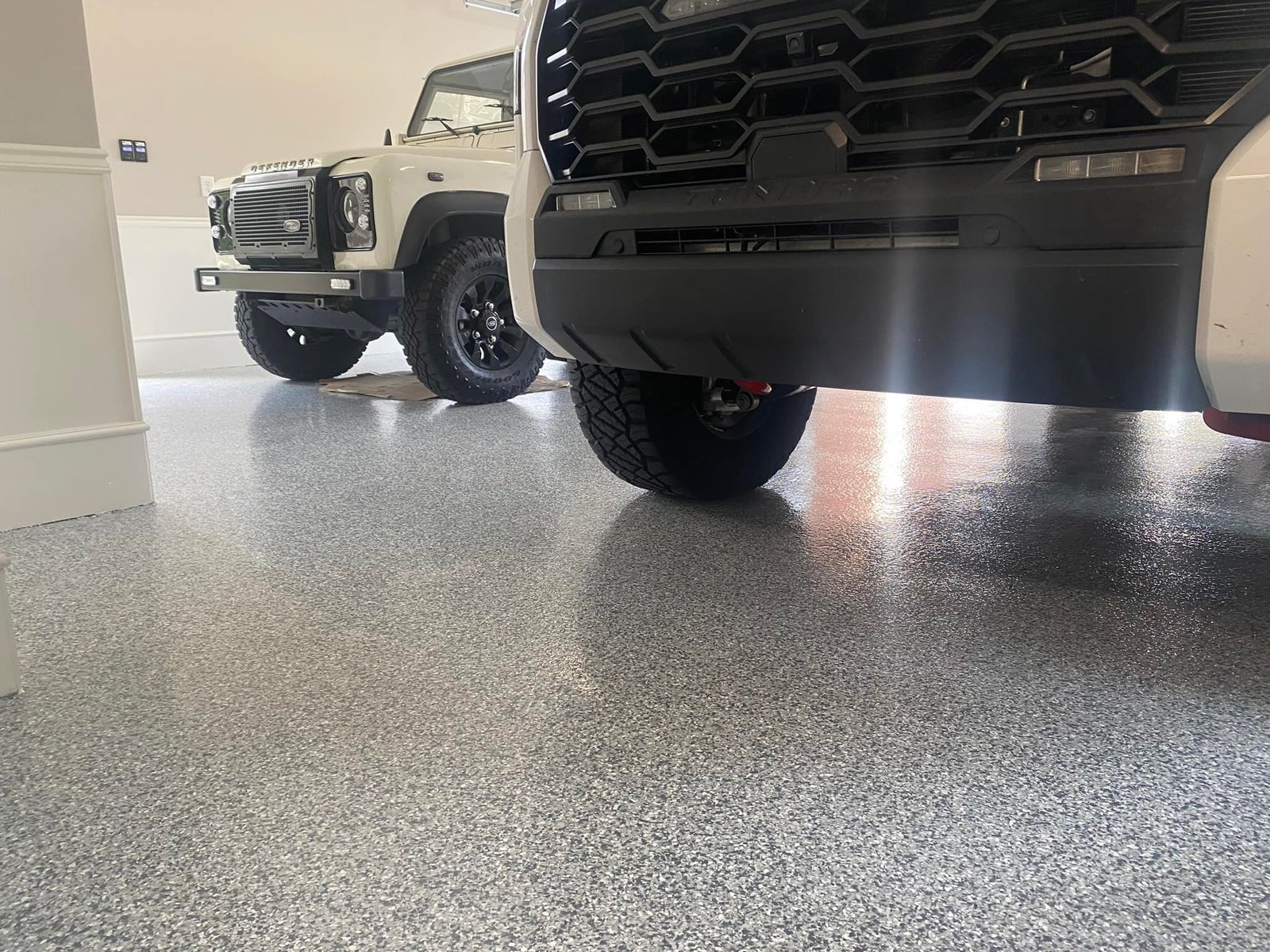 Epoxy flooring with a polyaspartic top coat delivers strength and fast curing performance. This system is ideal for garages, commercial spaces, and industrial environments.